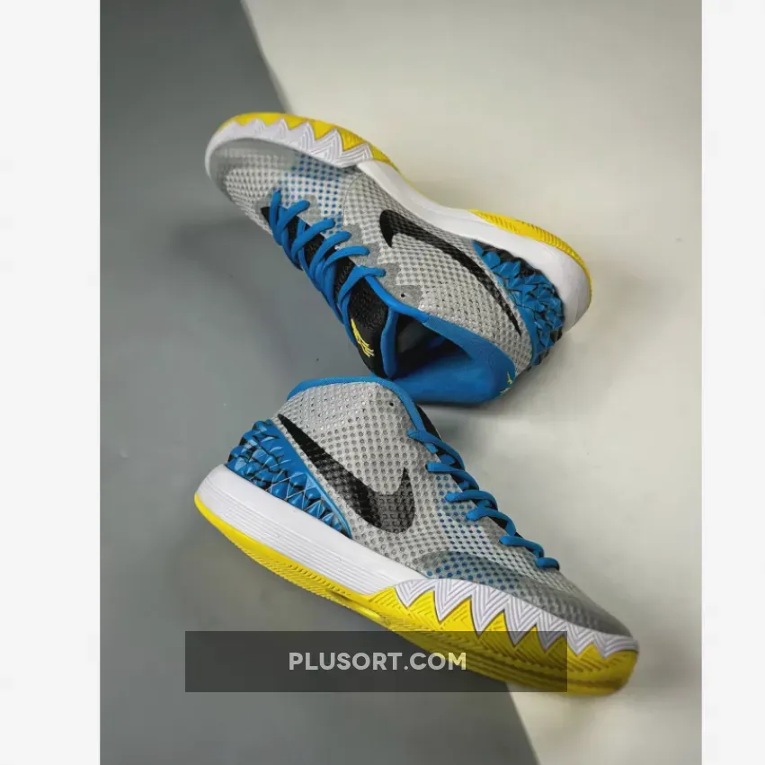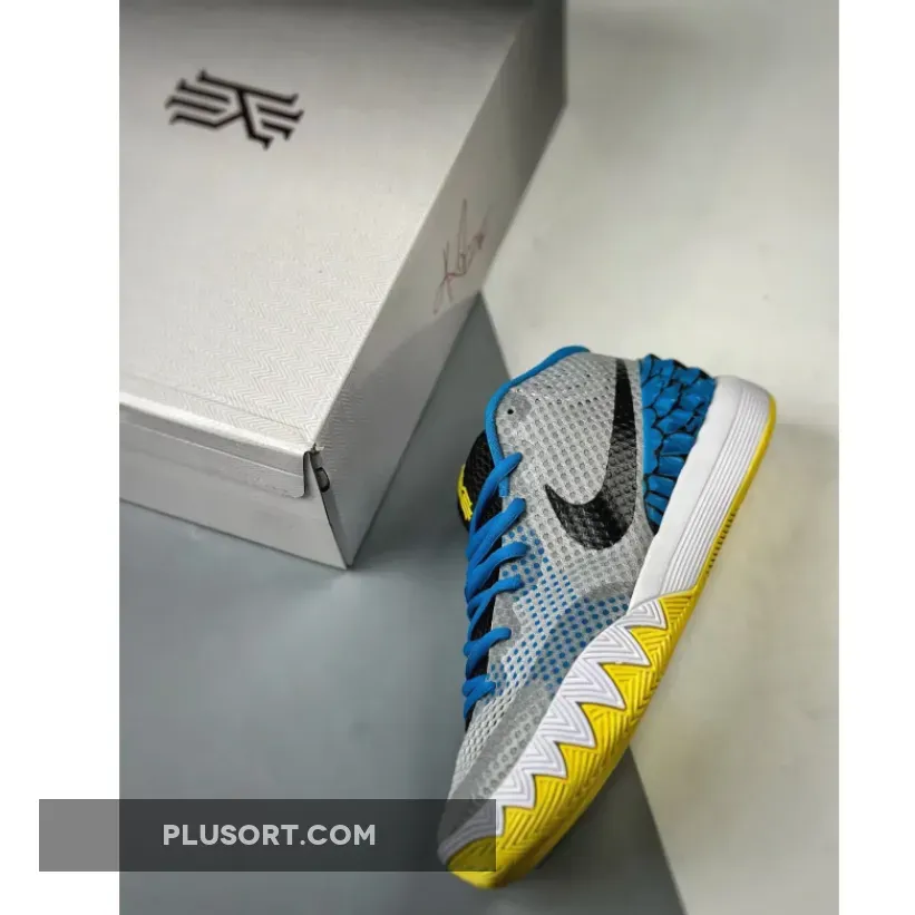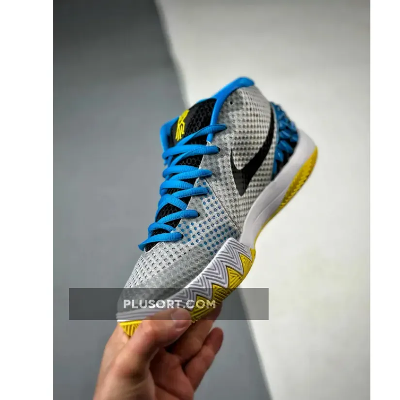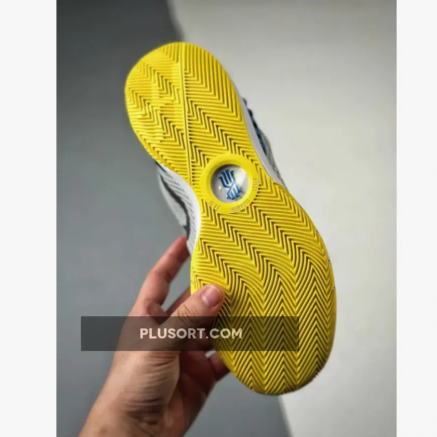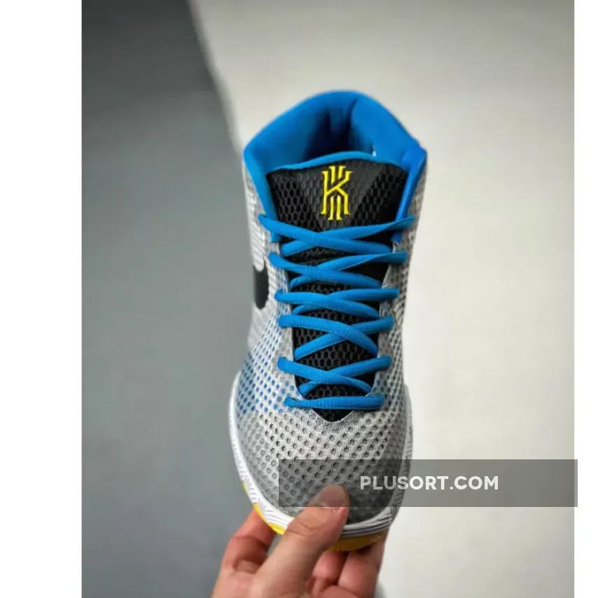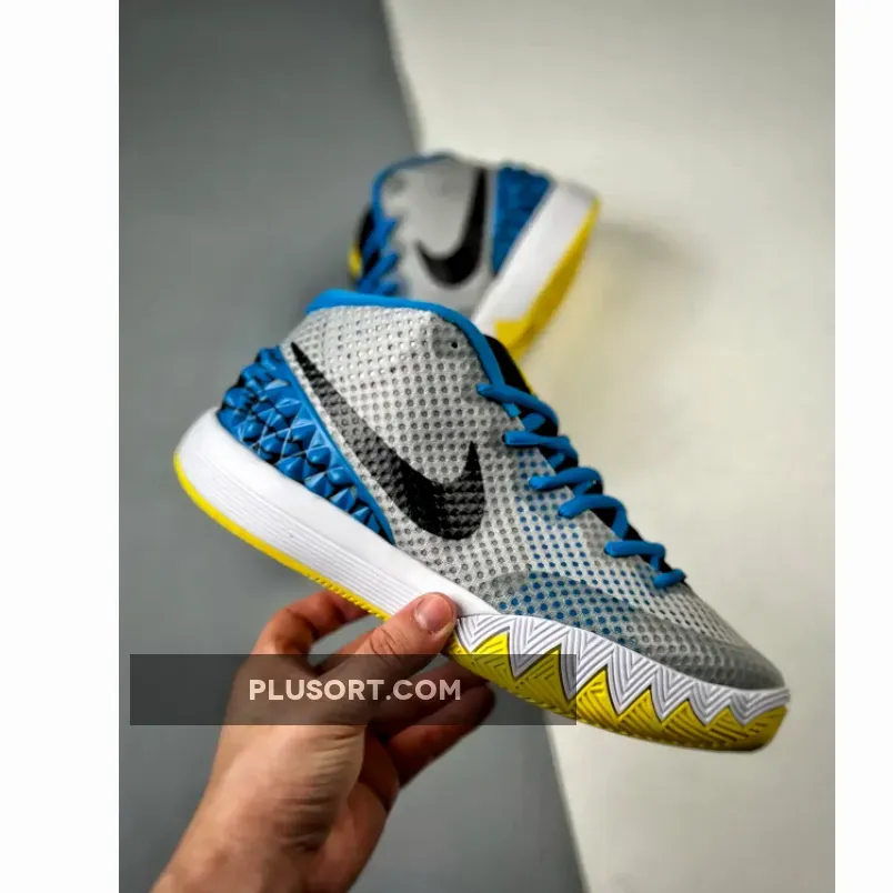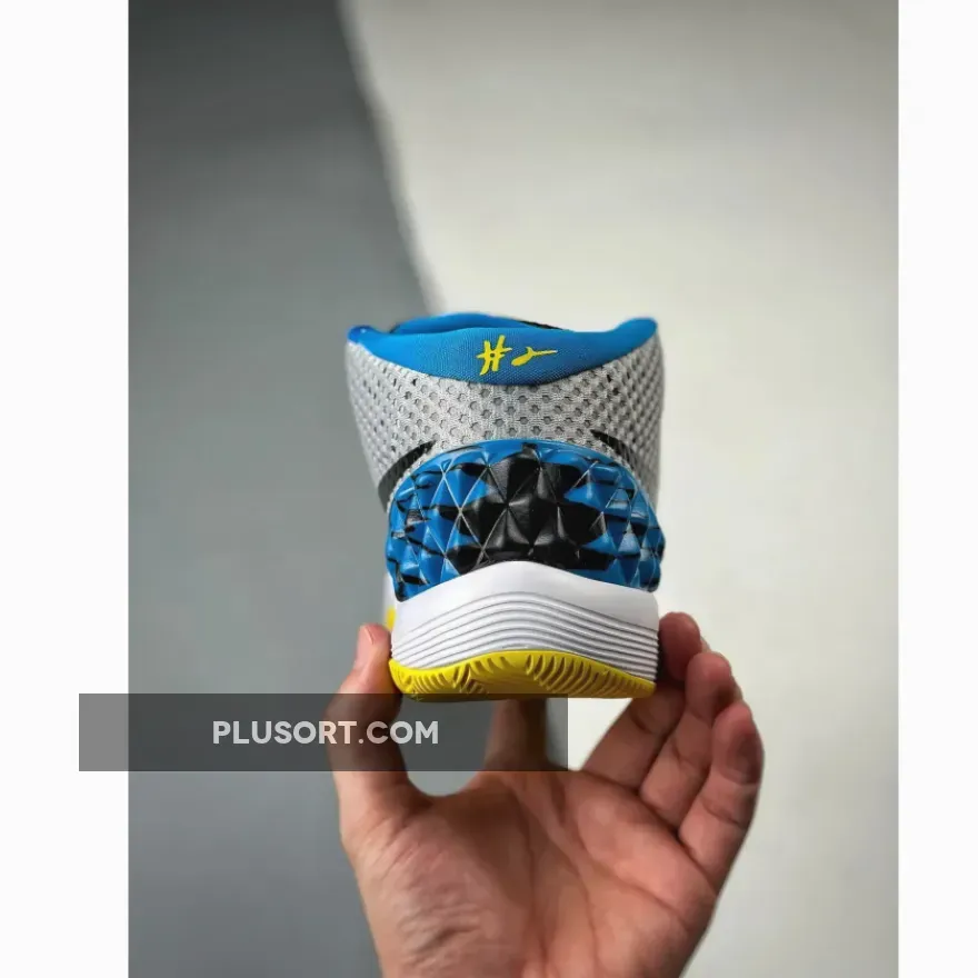 the Nike Kyrie 1 is dressed in a White, Black, Light Voltage Yellow, Light Photo Blue, and Metallic Silver color scheme. The shoe features a White-based upper with Black detailing on the tongue and Nike Swoosh logos. Other highlights of this Kyrie 1 includes a Wings-like graphic on the heel, Metallic Silver hints and Yellow and Blue accents.