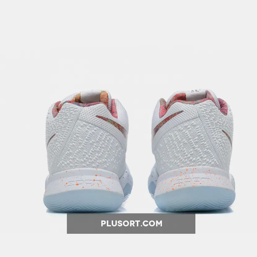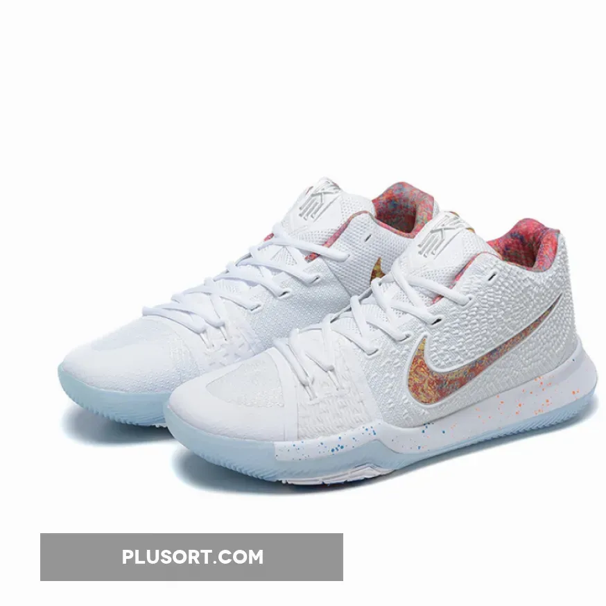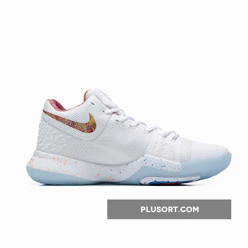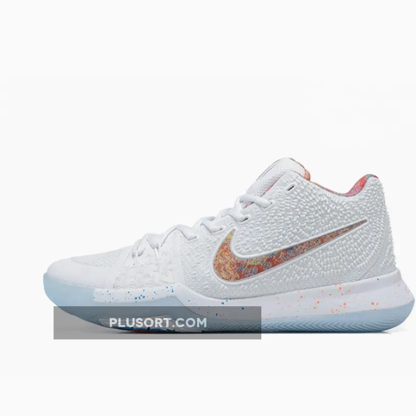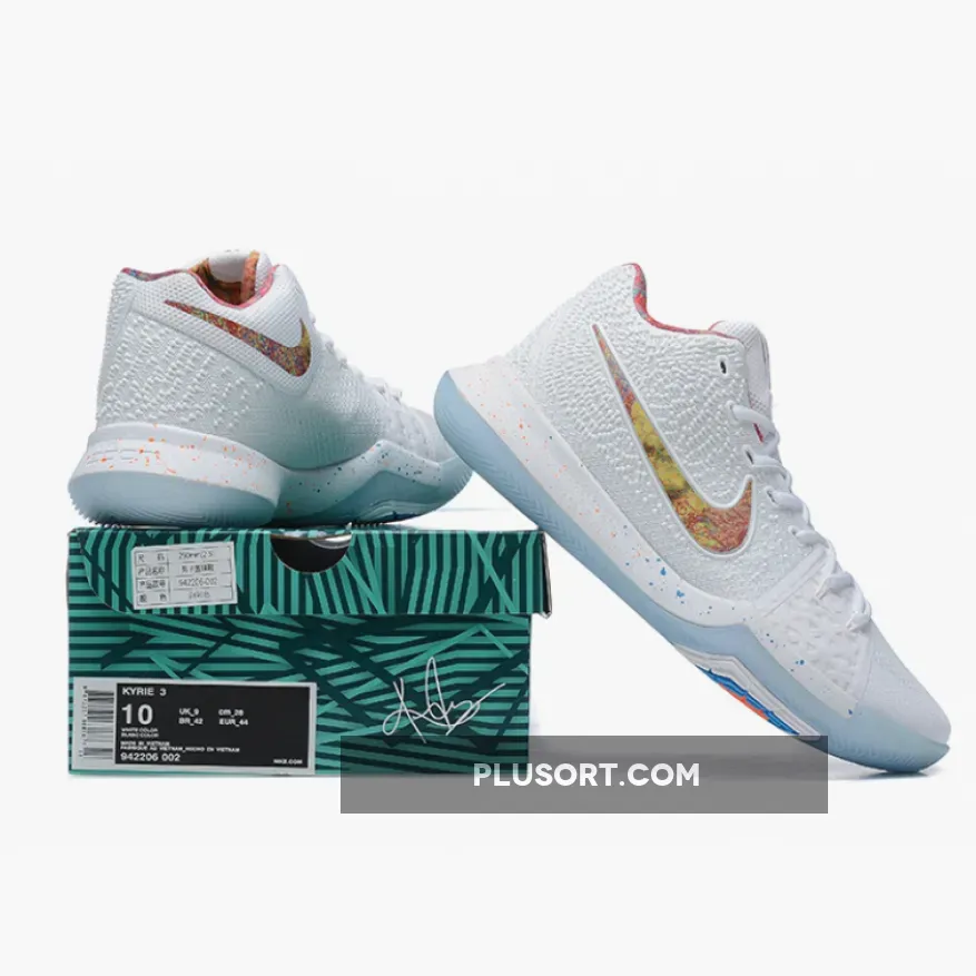 The Nike Kyrie 3 EYBL comes in a White base upper contrasted by a multi-colored print/design placed on the lining, Nike Swoosh and the speckling on the midsole. Other details include a speckled midsole, EYBL branded insoles and translucent outsole.