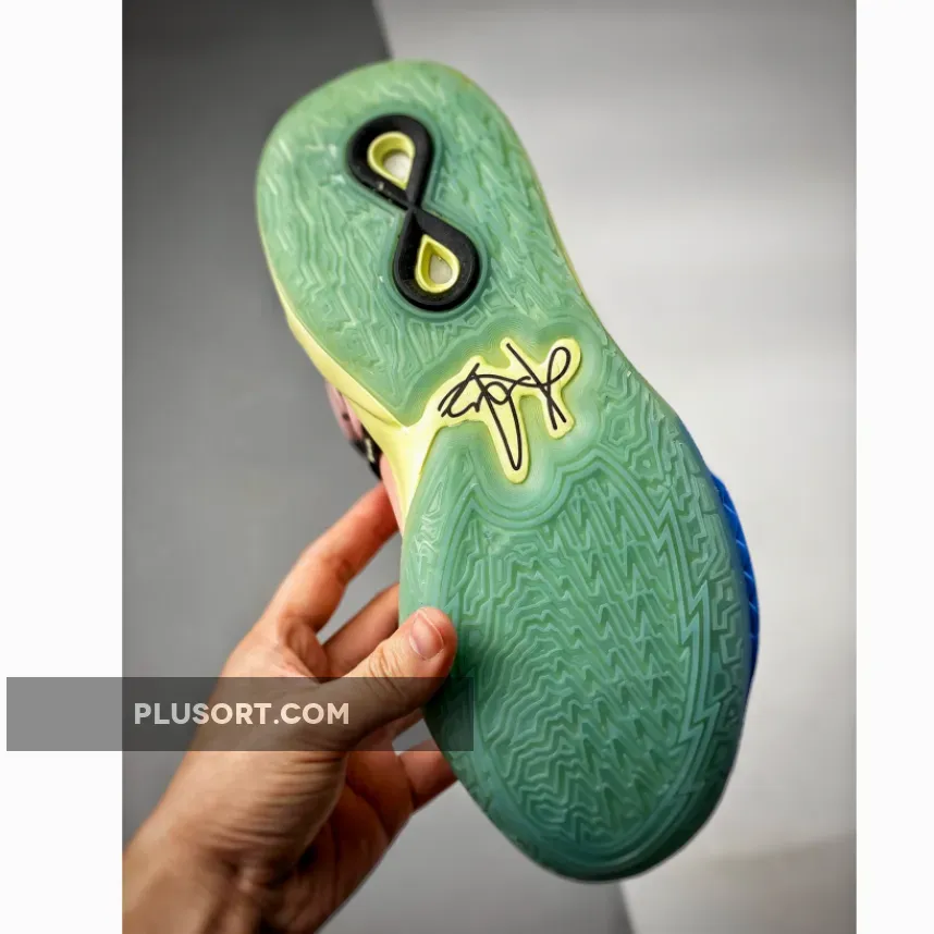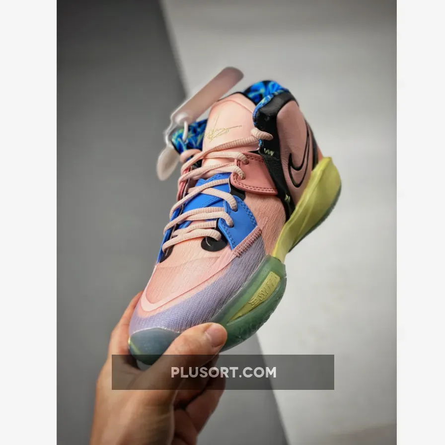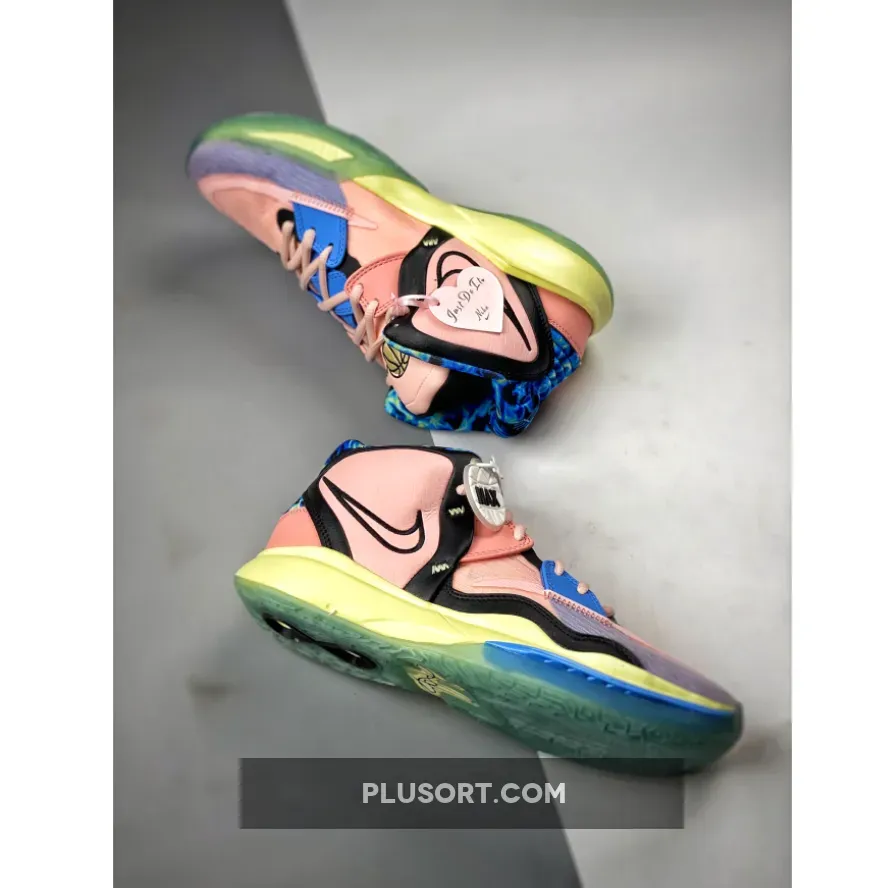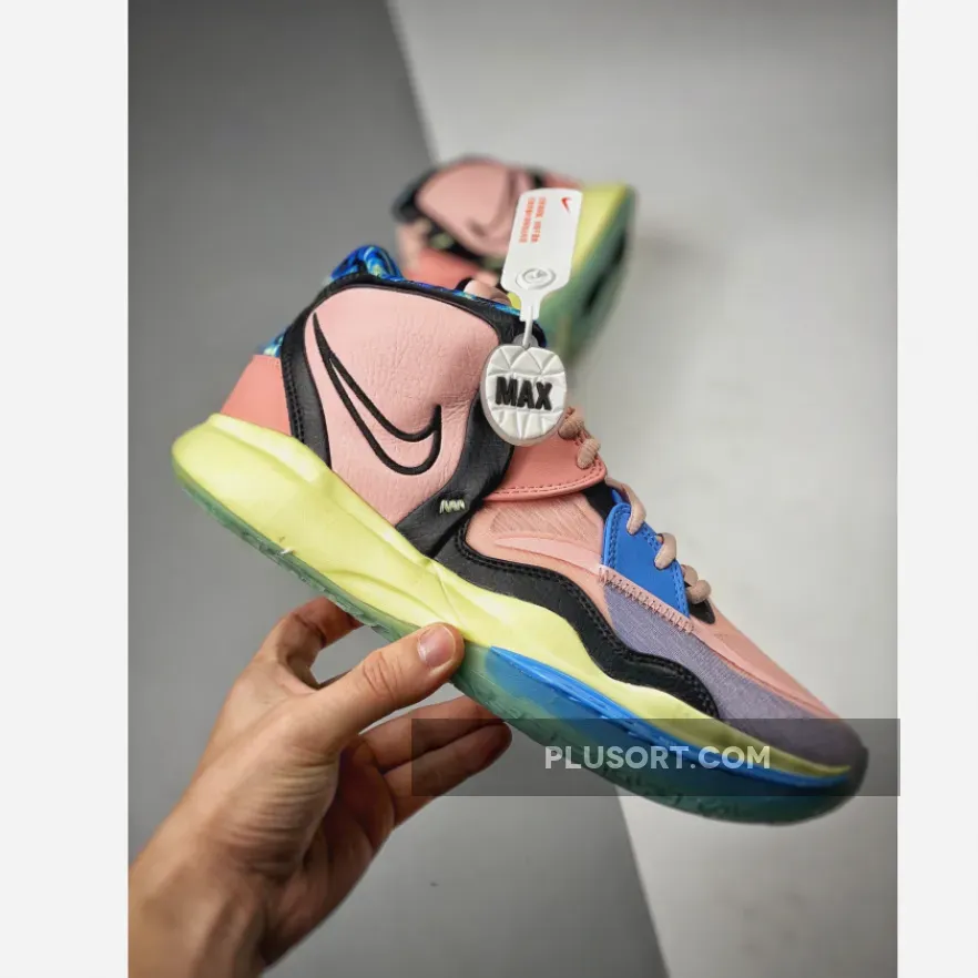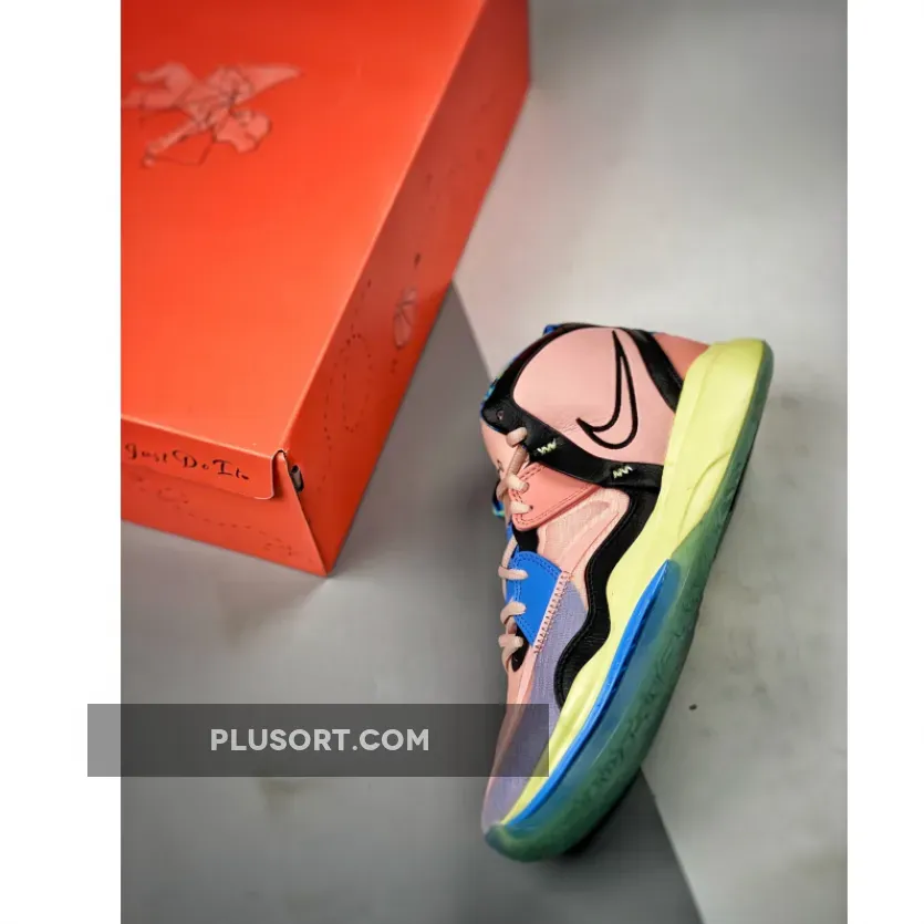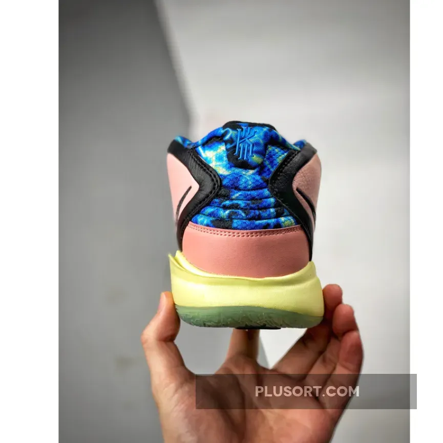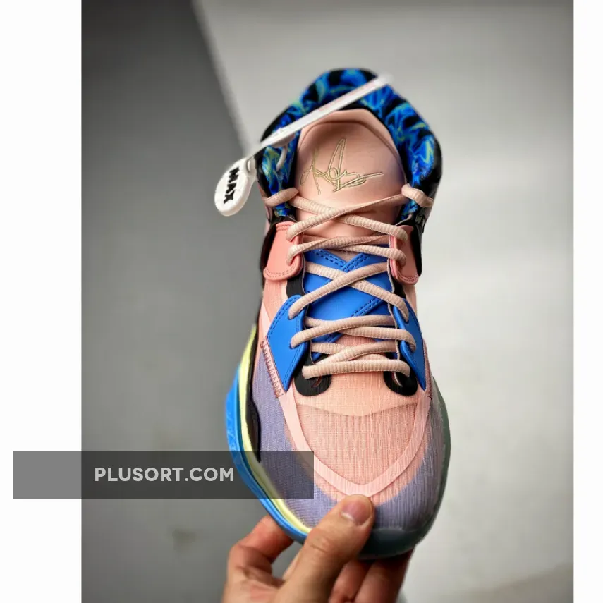 The Nike Kyrie 8 Valentine’s Day comes dressed in a Pink upper paired up with Blue accents found throughout the upper and sole unit. Other notable details include the Blue-heavy graphics on the lining and heel atop a Pale Yellow midsole. Valentine’s Day motifs come by way of the heart-arrowed basketball on the left tongue with a cupid logo on the insole.