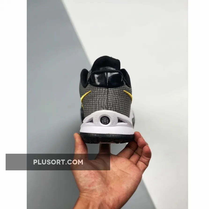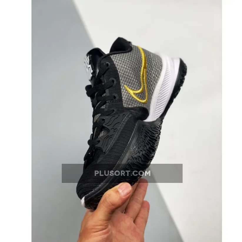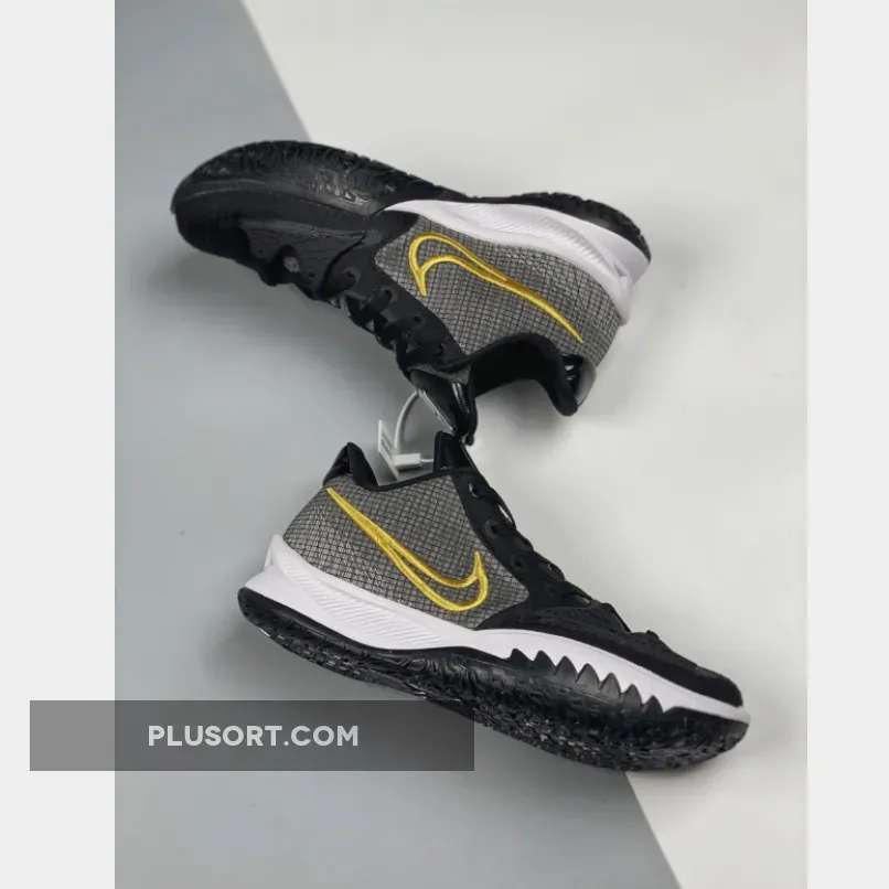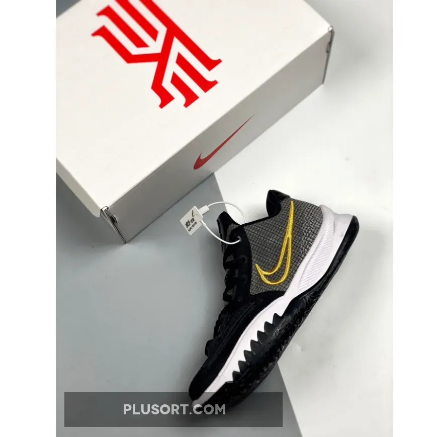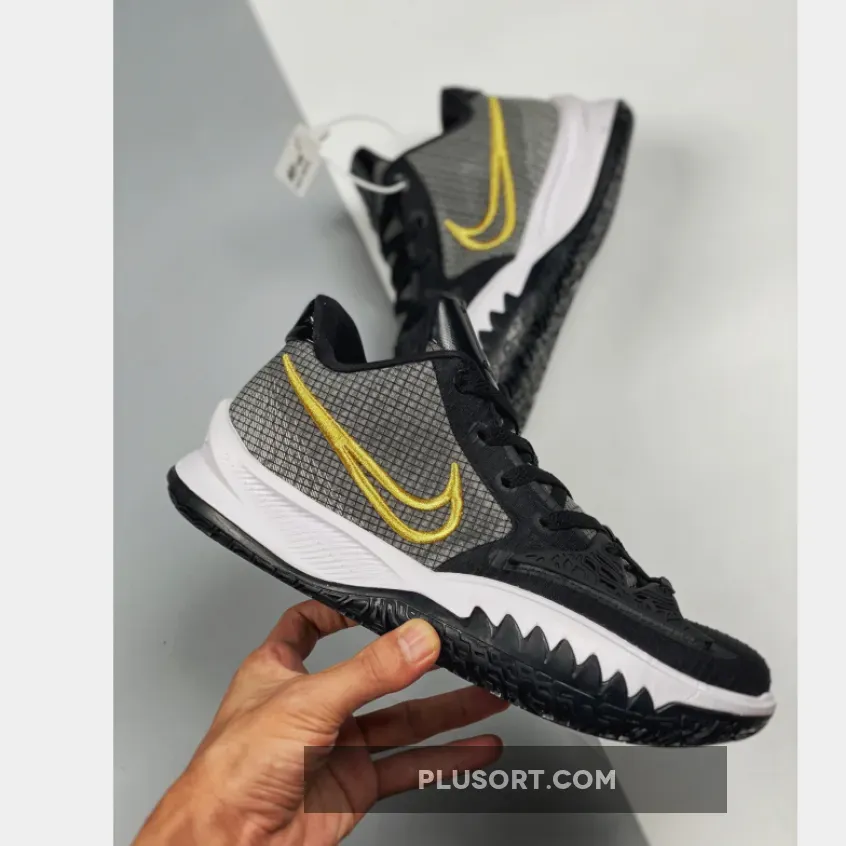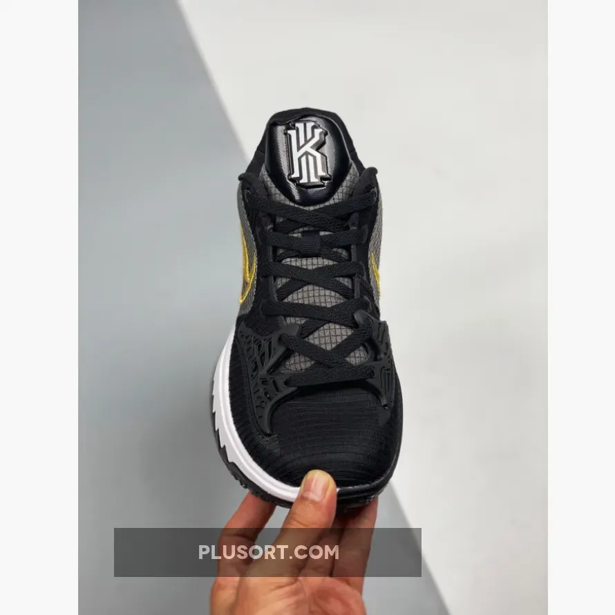This offering of the Nike Kyrie Low 4 features a Black-based upper with a molded cage overlay on the forefoot.