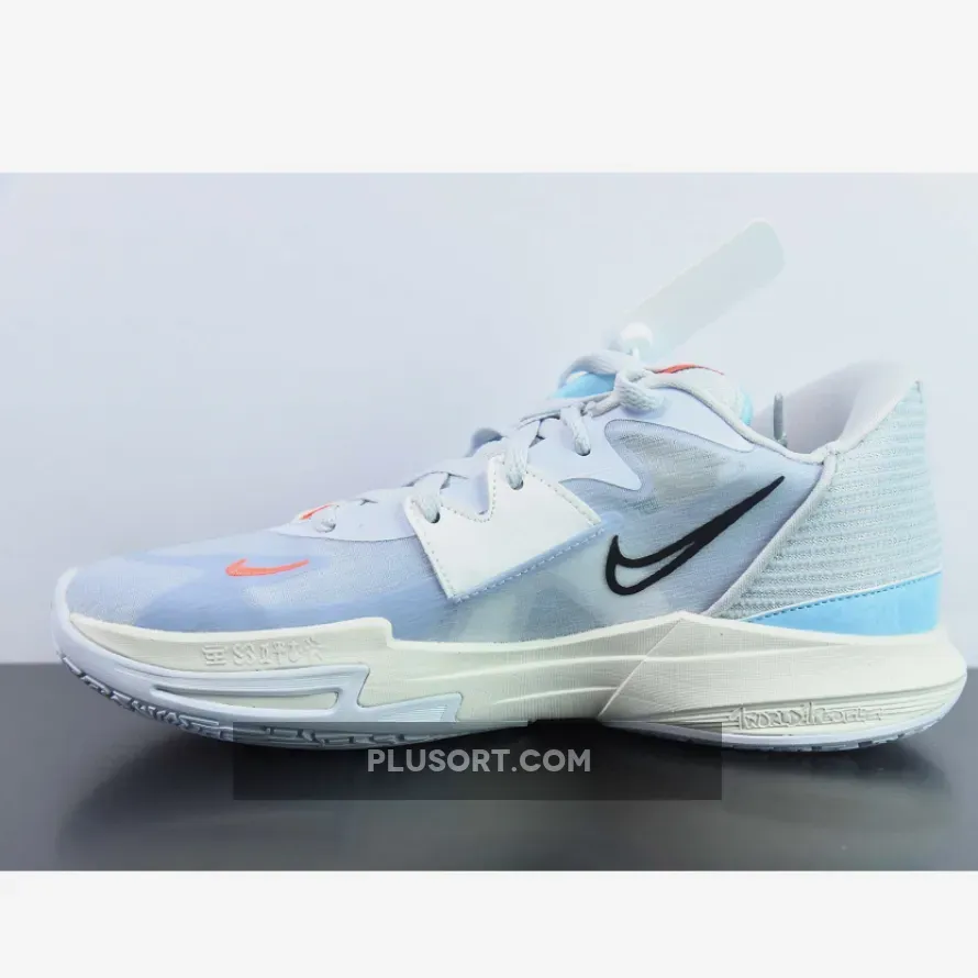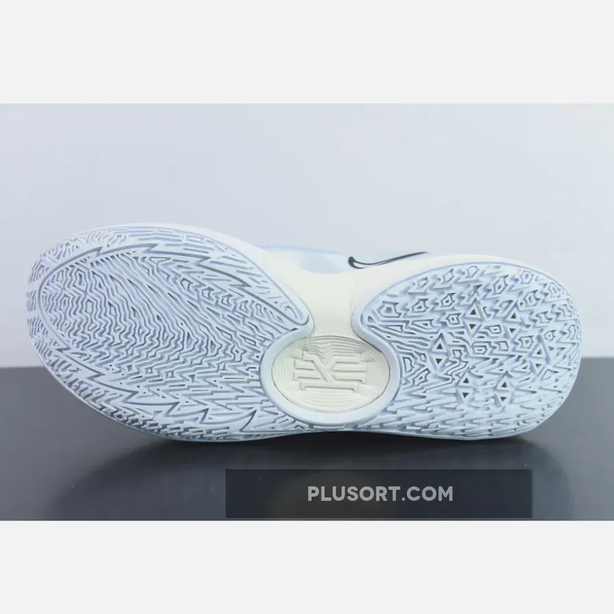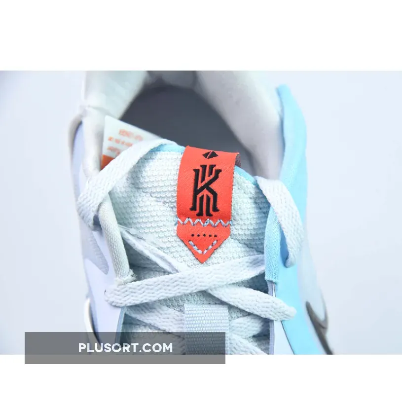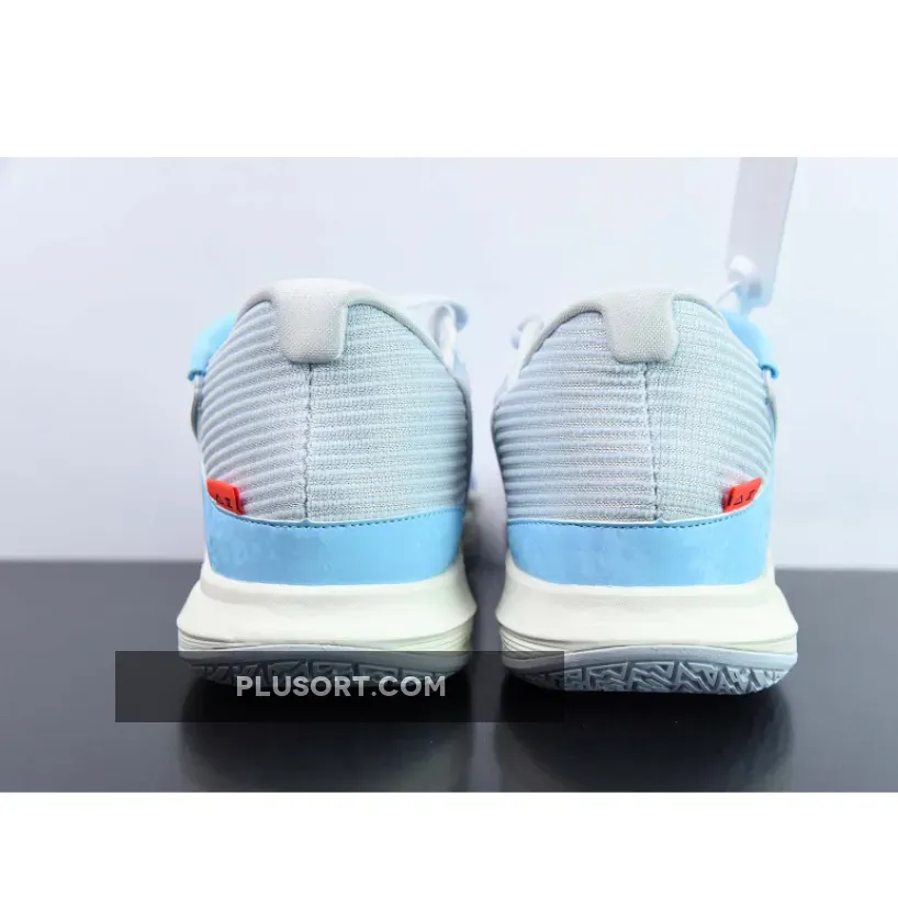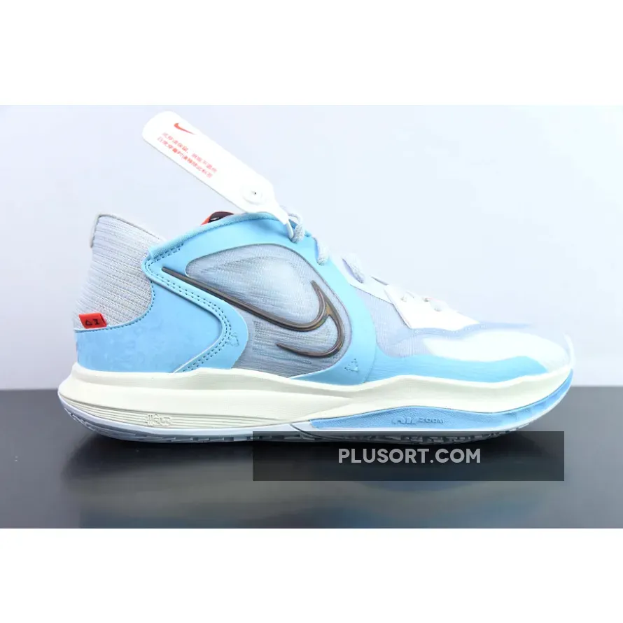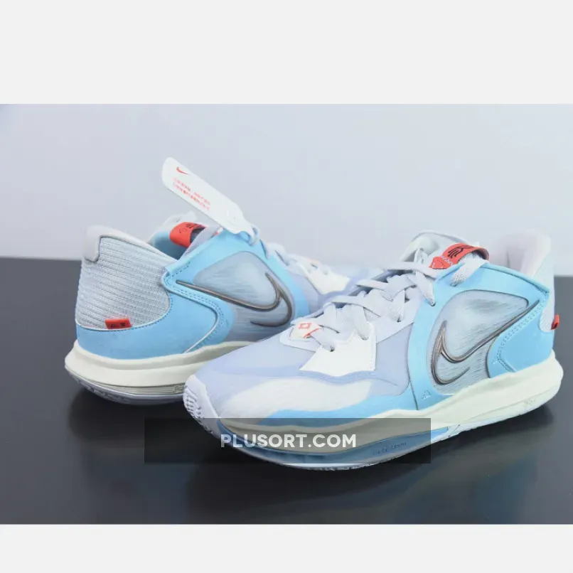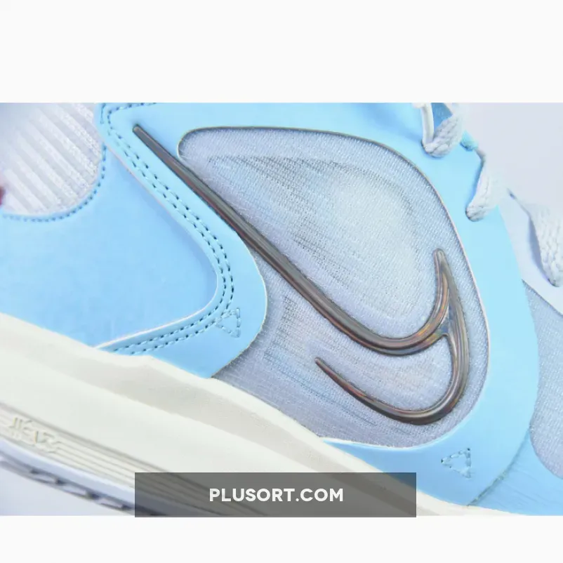 This Nike Kyrie Low 5 features an icy color scheme seeing its mesh and mixed textile base dressed in light grey while contrasting hits of light blue dress the overlays.