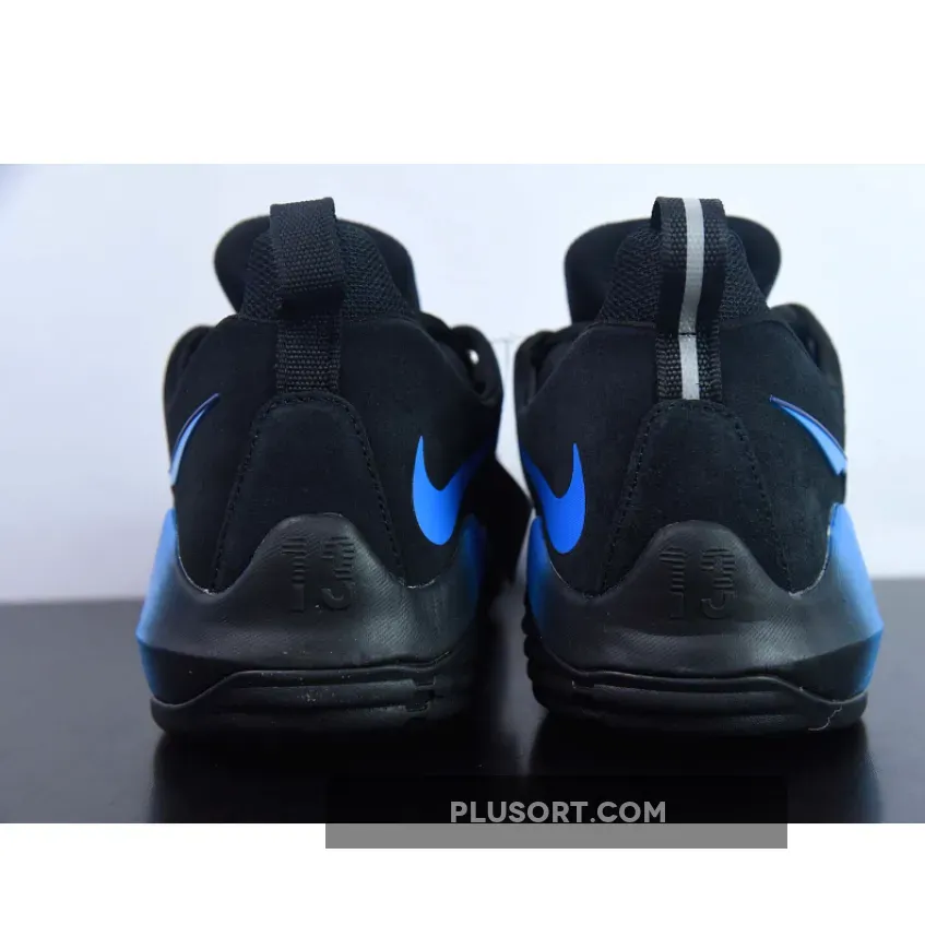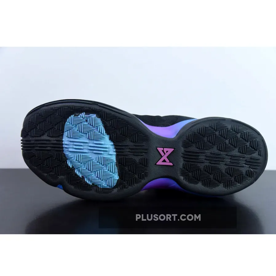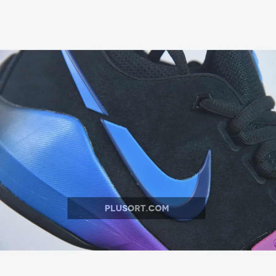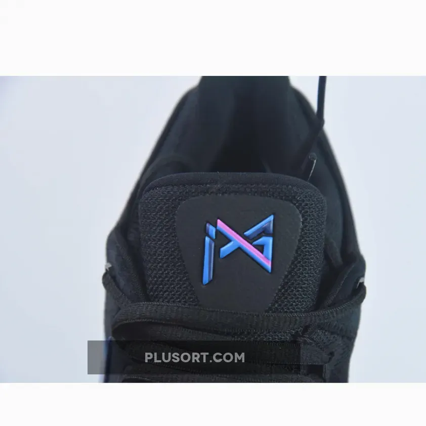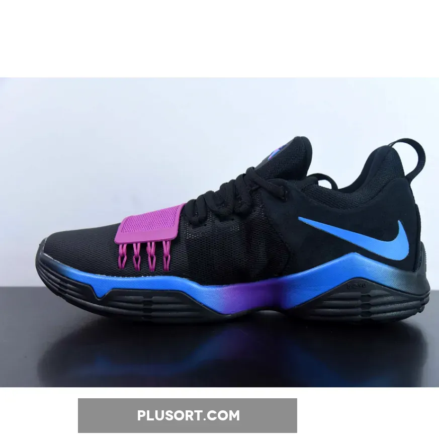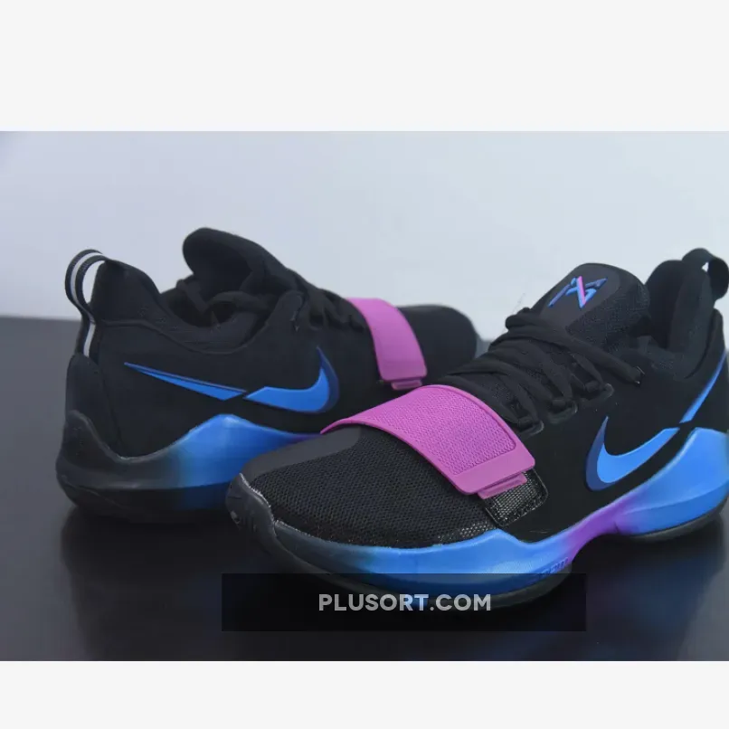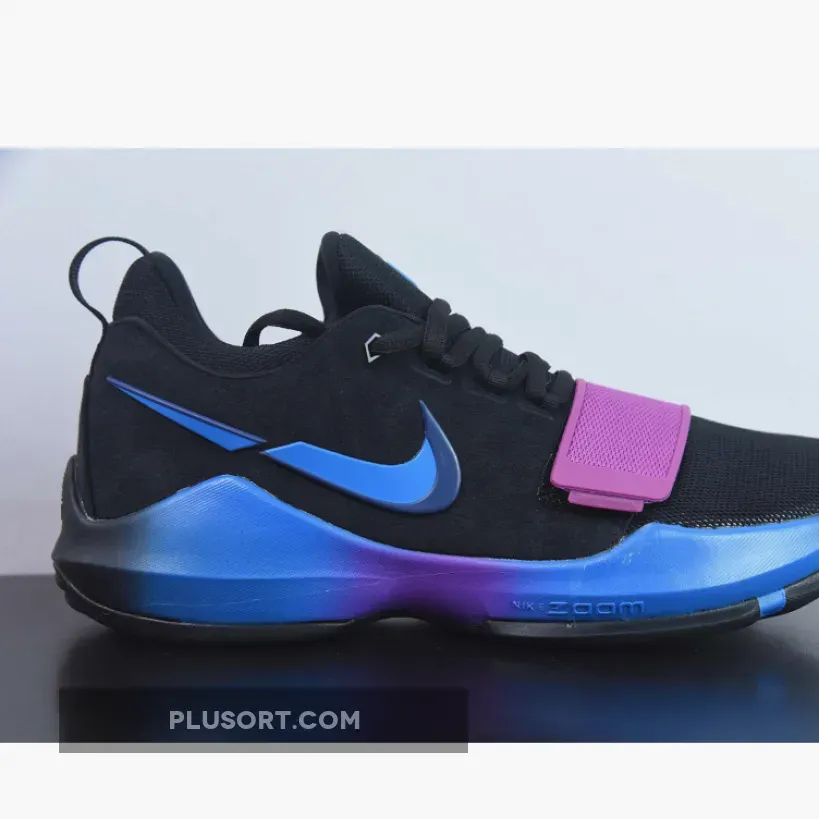 This PG 1 features a predominantly Black upper with shades of blue and purple on the gradient midsole, midfoot strap, tongue logo, and the broken Swoosh logo.