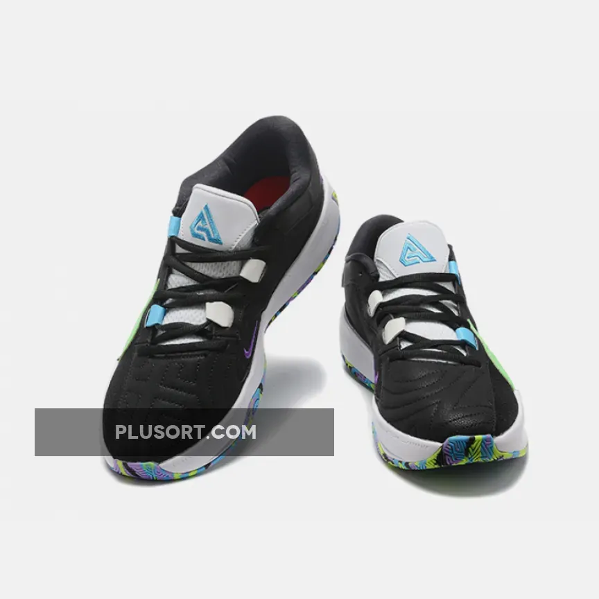 This offering of the Nike Zoom Freak 5 features a Black mesh upper covered in a tonal geometric pattern with leather leather overlays along the toe, eyestays, and collar. Pops of color can be found on the blue eyestays and branding on the white tongue. A large volt green Nike Swoosh adorns the midfoot, partially sunken into the midsole and covered with a black geometric pattern on the bottom portion.