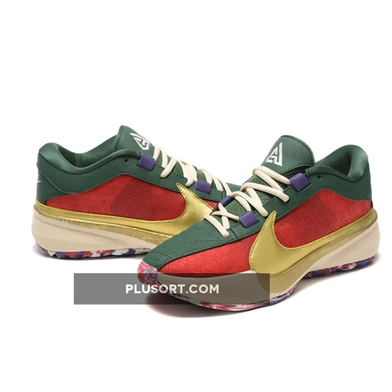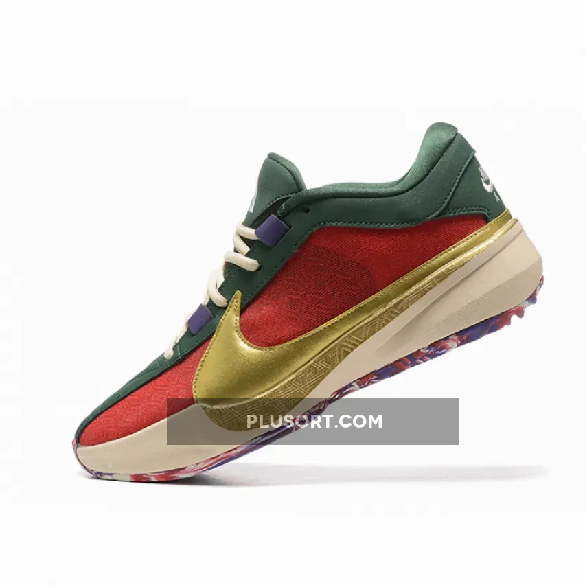 The Nike Zoom Freak 5 is quite a sizable departure from its predecessors in terms of design, forgoing the backwards Swoosh that’s dressed almost every model. Instead, a Swoosh double its size is in its place, sitting just between the upper and midsole. The silhouette appears to be much more streamlined in its construction, forgoing the visible signature Air Unit on the sole. The first shoe appears to arrive in a gym red and metallic gold colorway. The shoe’s heel, tongue, and center of the upper is covered in a deep green, while the shoe sits atop a tri-color outsole to round off the design.the sole unit, too, is similarly simple, forgoing the visible Air Unit signature to the Zoom Freak 4.