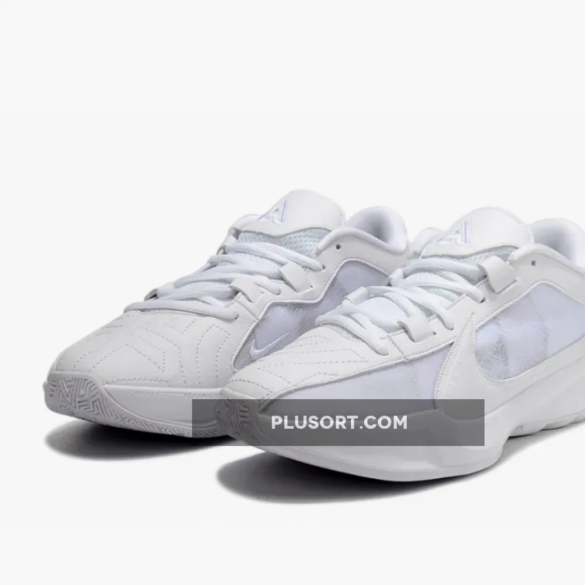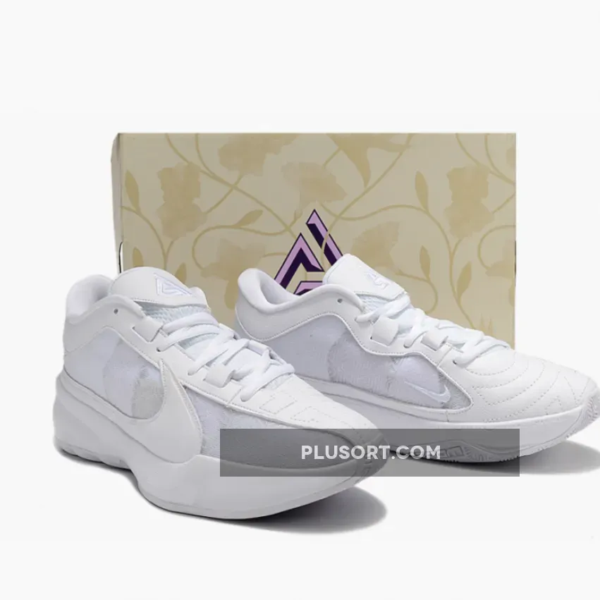 As mentioned, this Nike Zoom Freak 5 comes dressed in all-White, a perfect fit for the warmer months. Utilizing a semi-translucent TPU base, leather on the toe, heel, and Swoosh logos, while a unique graphic appears on the panels and we have mesh tongues. Next, Antetokounmpo’s logo is embroidered on the tongue and Nike branding lands on the heels with a tonal finish.