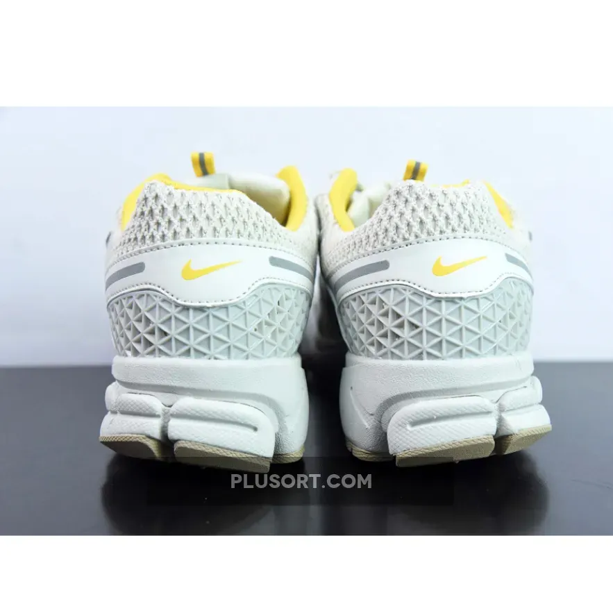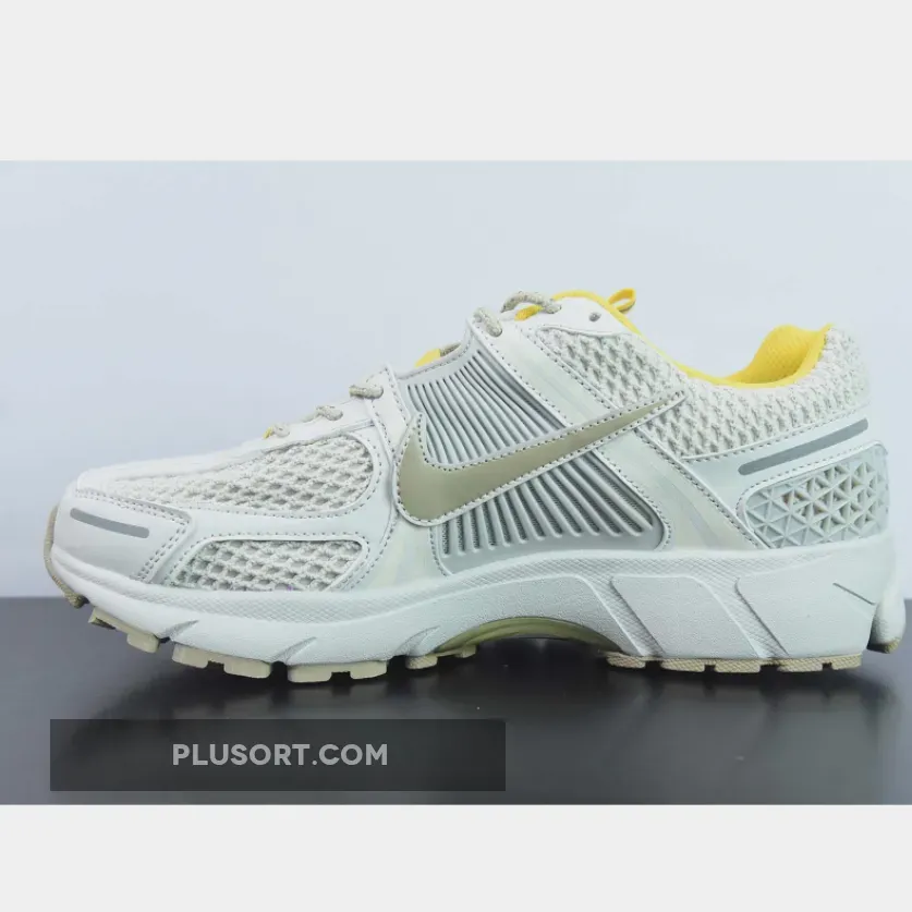 This offering of the Nike Zoom Vomero 5 comes constructed with an open mesh base with leather overlays highlighted with signature plastic side panels and heel counter. The leather overlays on the toe cap, mudguard, and heel panels as well as the slatted TPU mid-panels also follow the same colour as the base. The signature profile Swooshes on both the medial and lateral mid-panels are a soft light brown that blends with the rest of the upper. Pops of bright yellow appear in the form of the eye stay accents, the tongue pull tab and the mesh sock liner. A Light Bone-coloured Zoom midsole and a light brown rubber outsole wrap up the design of this sneaker.