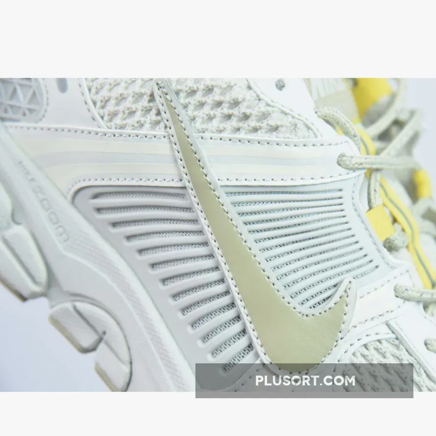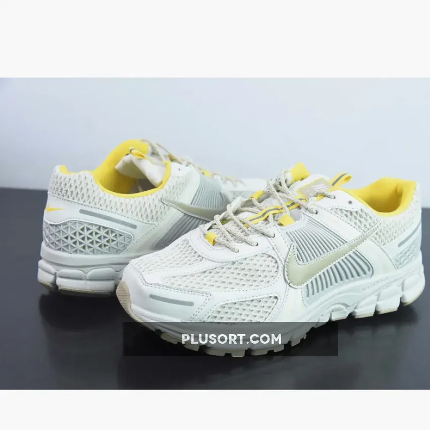 Nike’s running shoe made for maximum stability and cushioning and designed by the brand’s Innovation Kitchen, the Zoom Vomero 5, has a new bone-coloured offering with jolts of bright yellow.