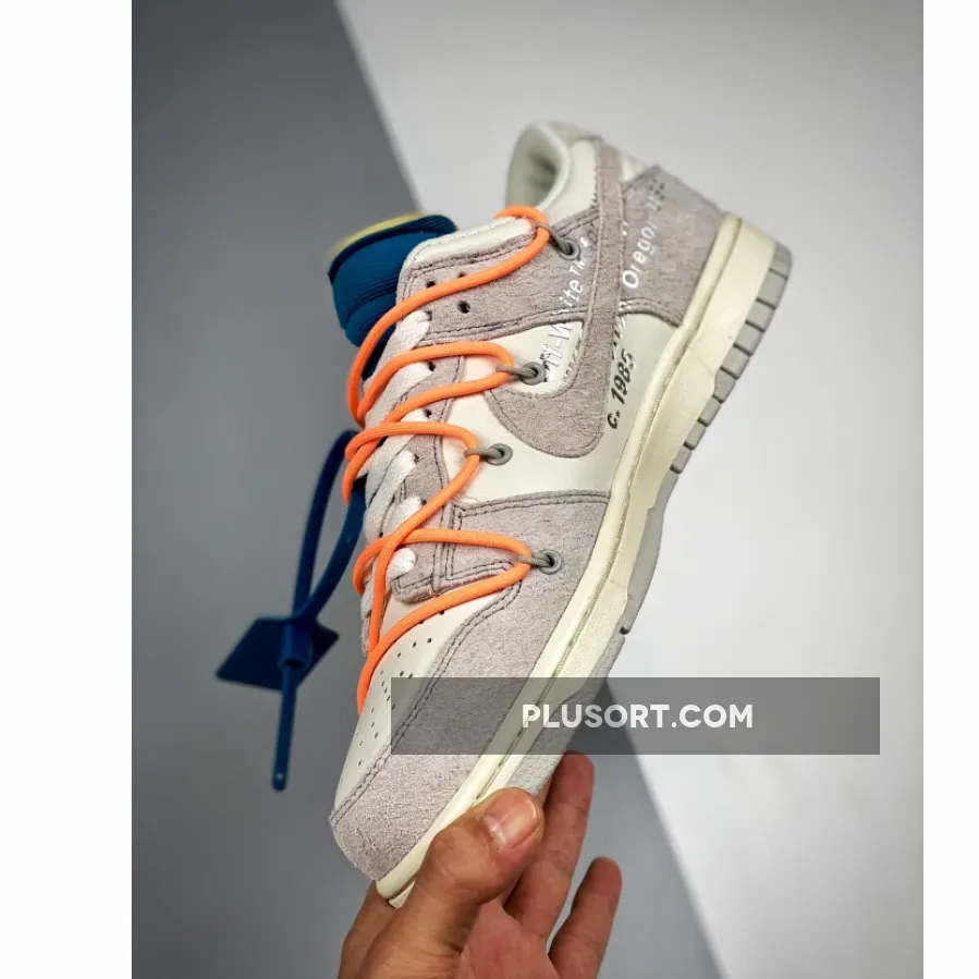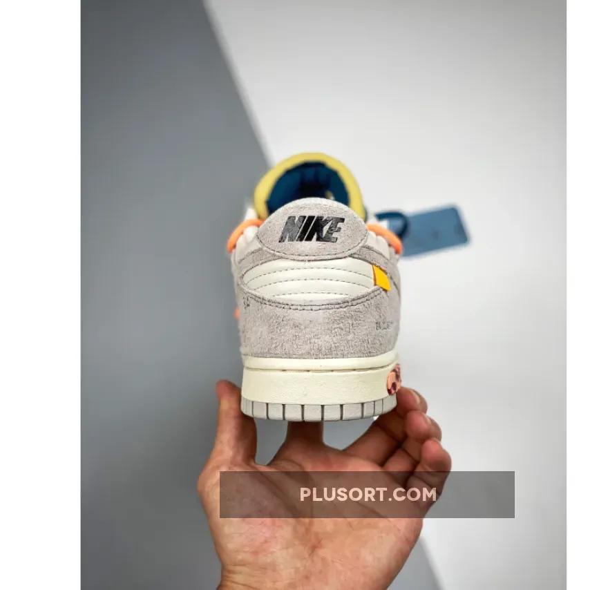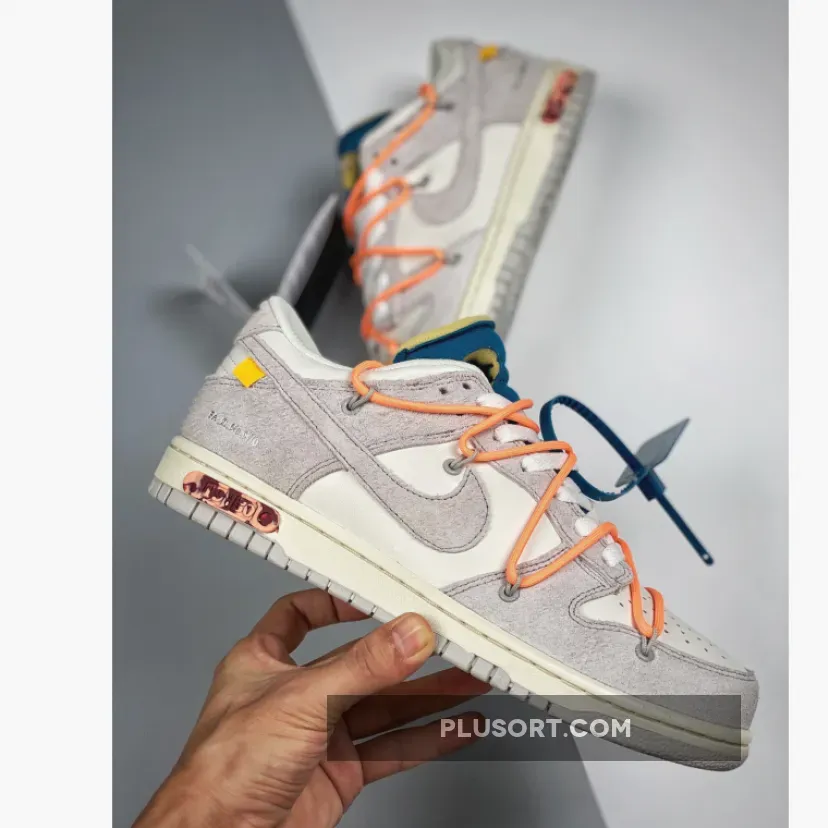 This Off-White x Nike Dunk Low is taken from the ‘Dear Summer’ collection, a sprawling follow-up to Virgil Abloh’s first Nike Dunk collaboration from 2019. The low-top makes use of a white leather upper with soft grey suede overlays, along with Virgil Abloh’s calling-card flourishes, which include a plastic zip tie and printed Helvetica text. nnContrasting pops of color arrive via the sneaker’s secondary lacing system, zip-tie, an exposed-foam tongue and a rectangular tab affixed to the Swoosh. Limited to fifty pairs, a ’19 of 50’ badge is affixed on the lateral midsole.