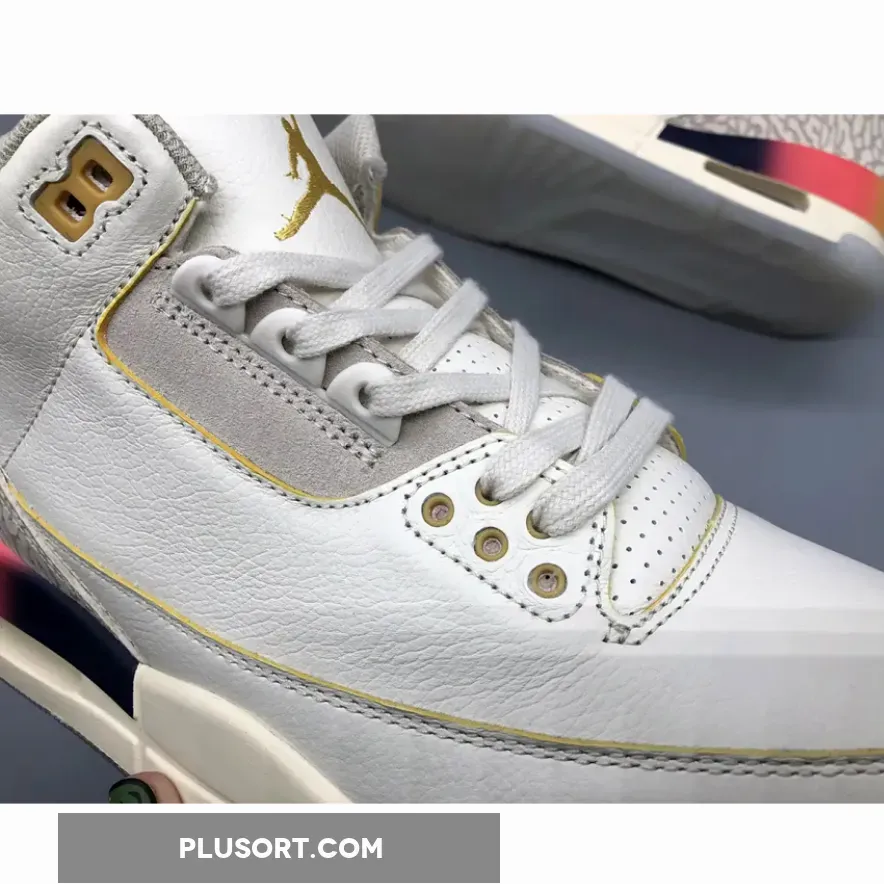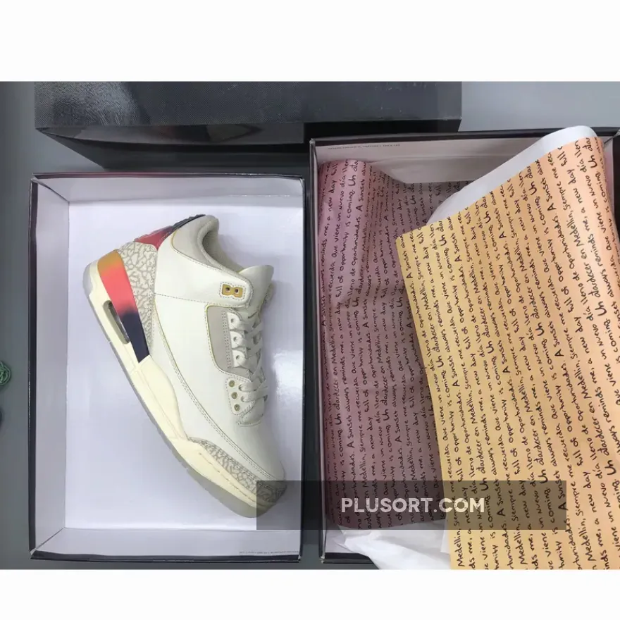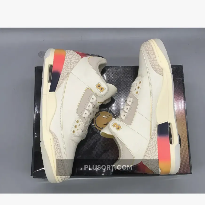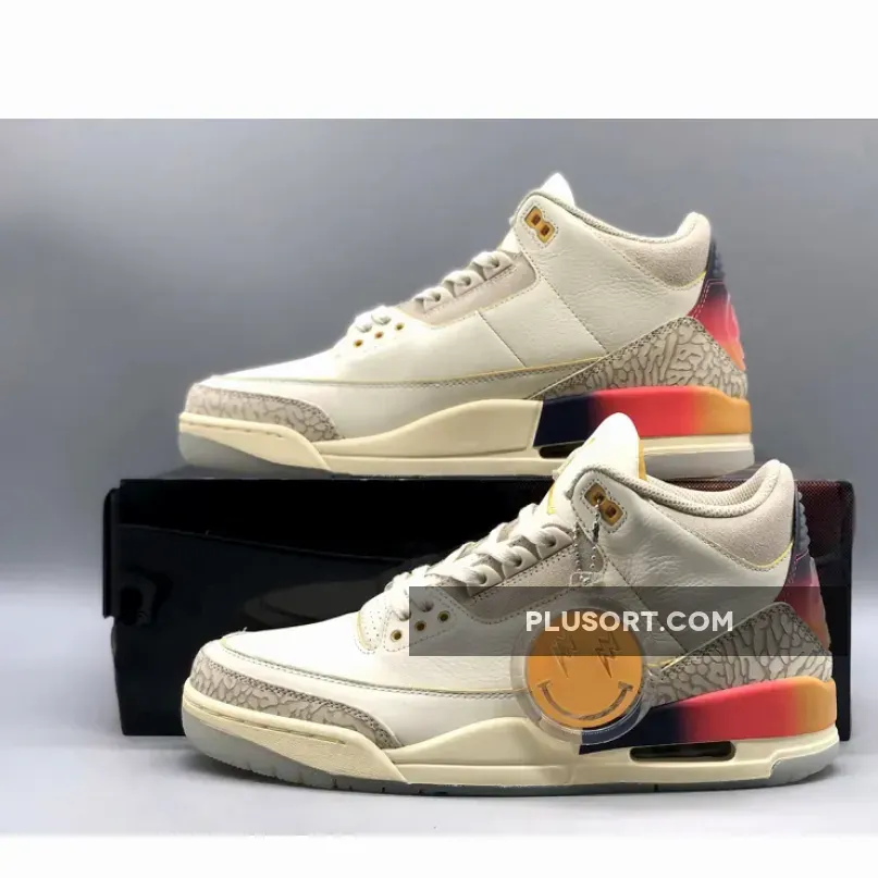 the J Balvin x Air Jordan 3 is given a Sail-colored leather base equipped with perforated tongues and Grey elephant print overlays on the toes and heels. The standout feature and detail is the multicolor gradient print along the midsole as well as on the heel tabs, which house “Nike Air” and J Balvin’s face logo respectively.