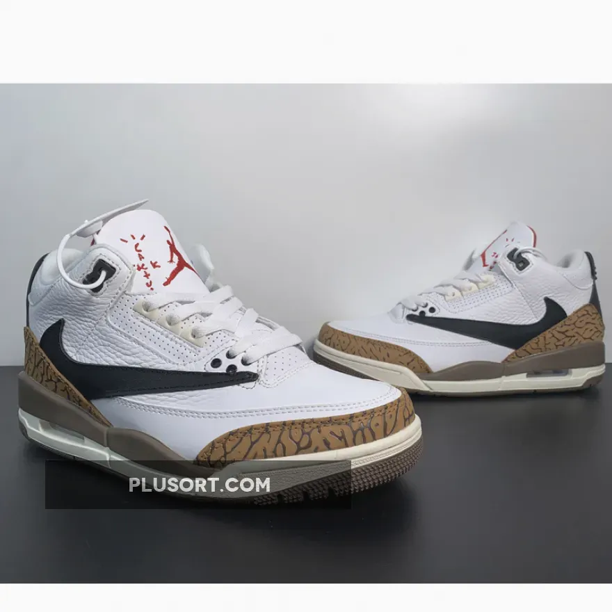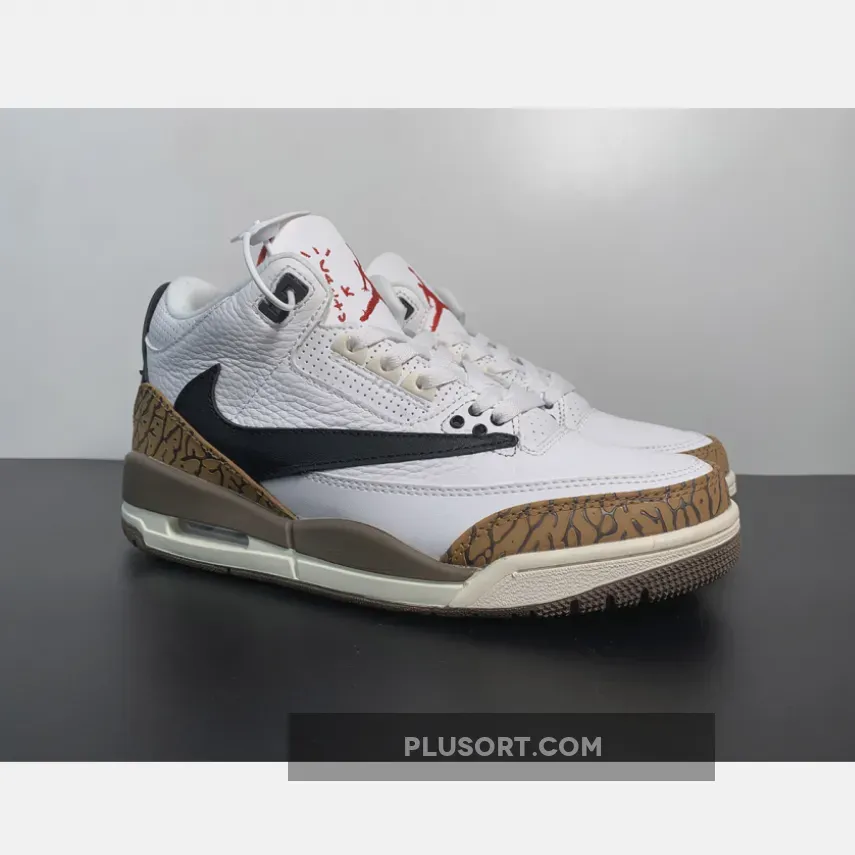 A tan hue is used for the forefoot overlays, elephant print embellishment, and lower heel tabs, which contrast with the brown rubber outsoles and trims. On the profile reversed swooshes and heel counters, black is combined with another color.