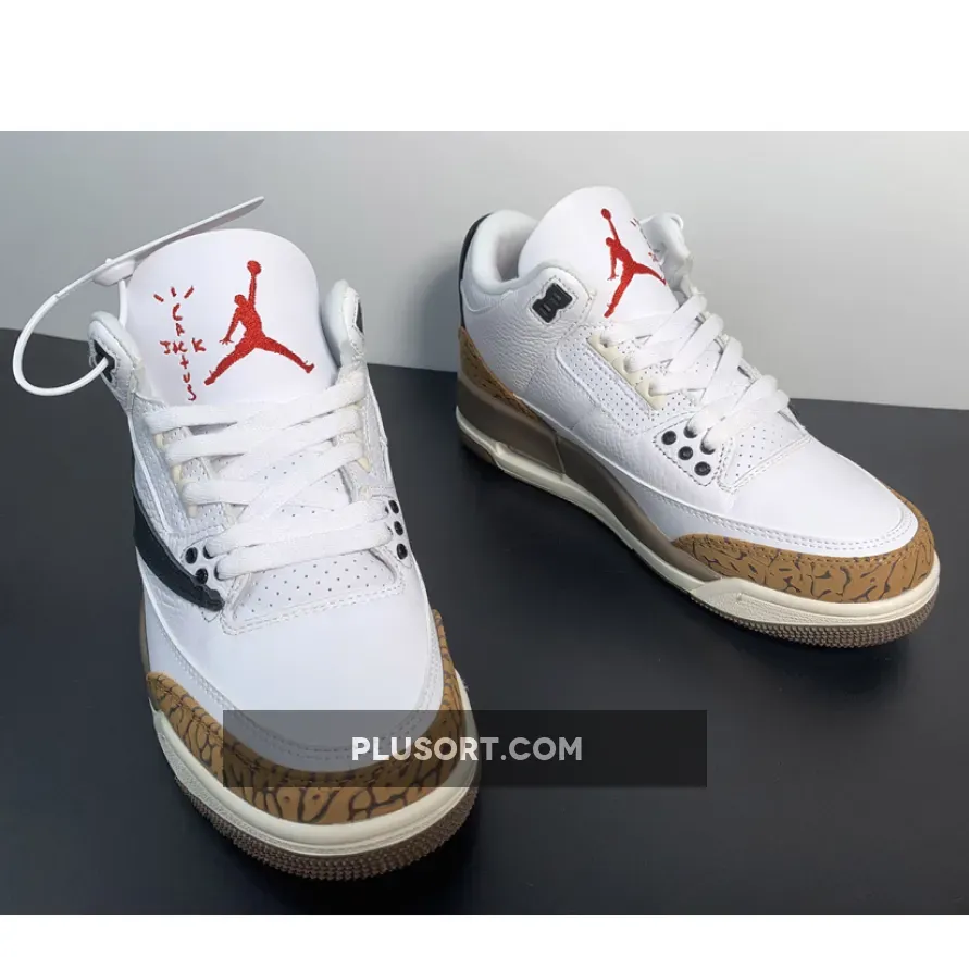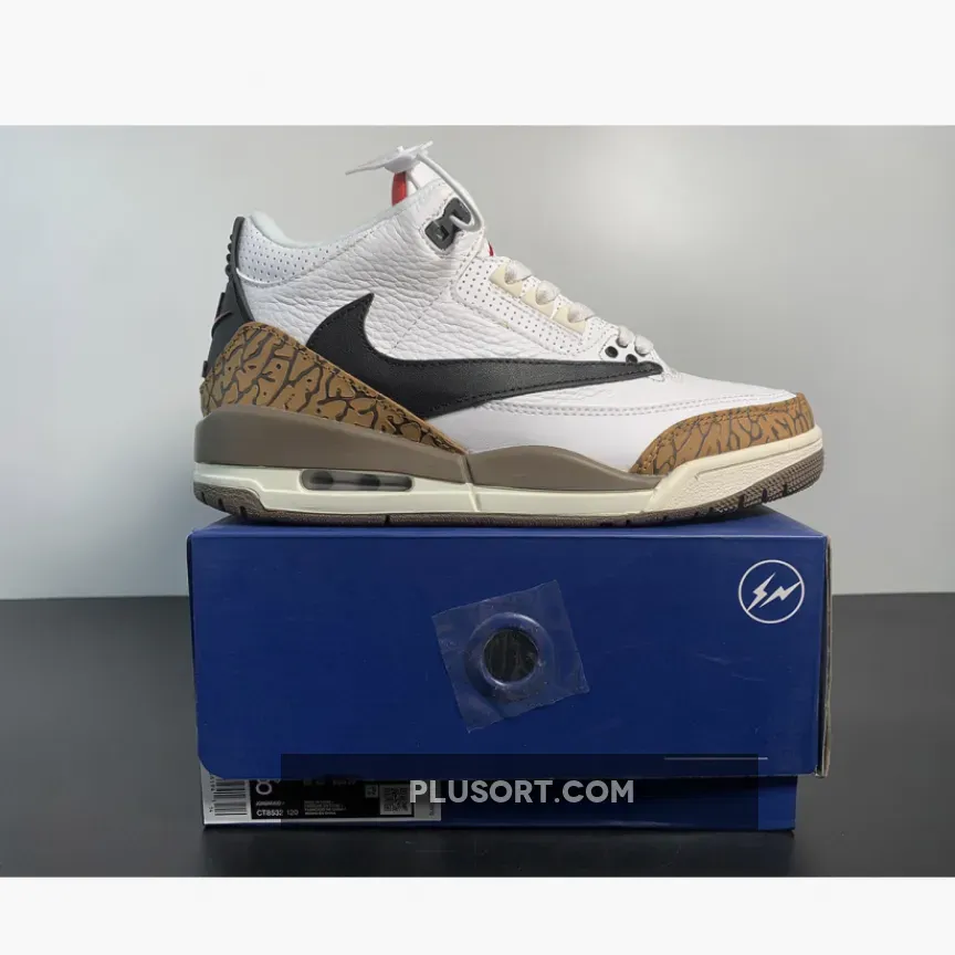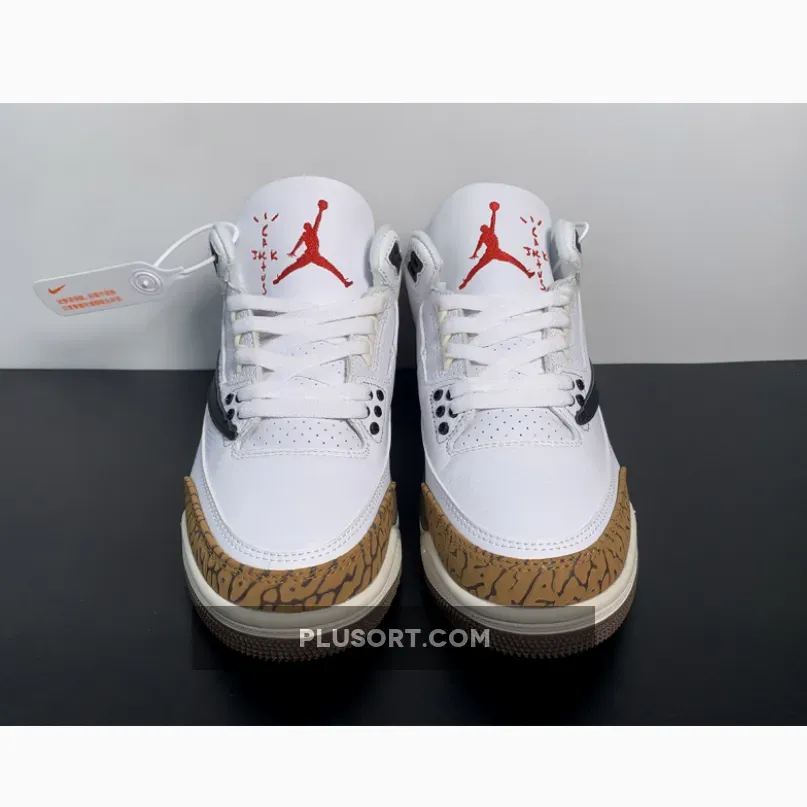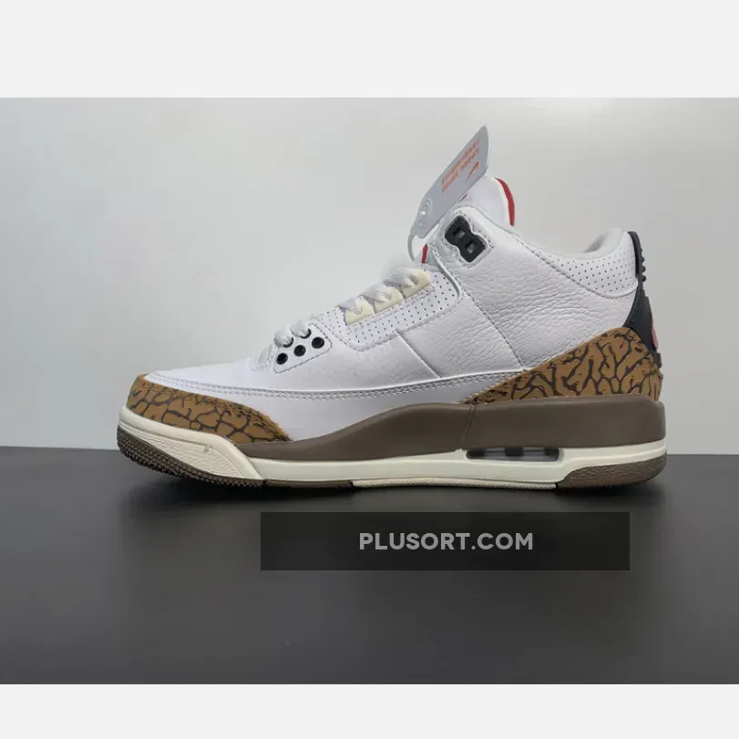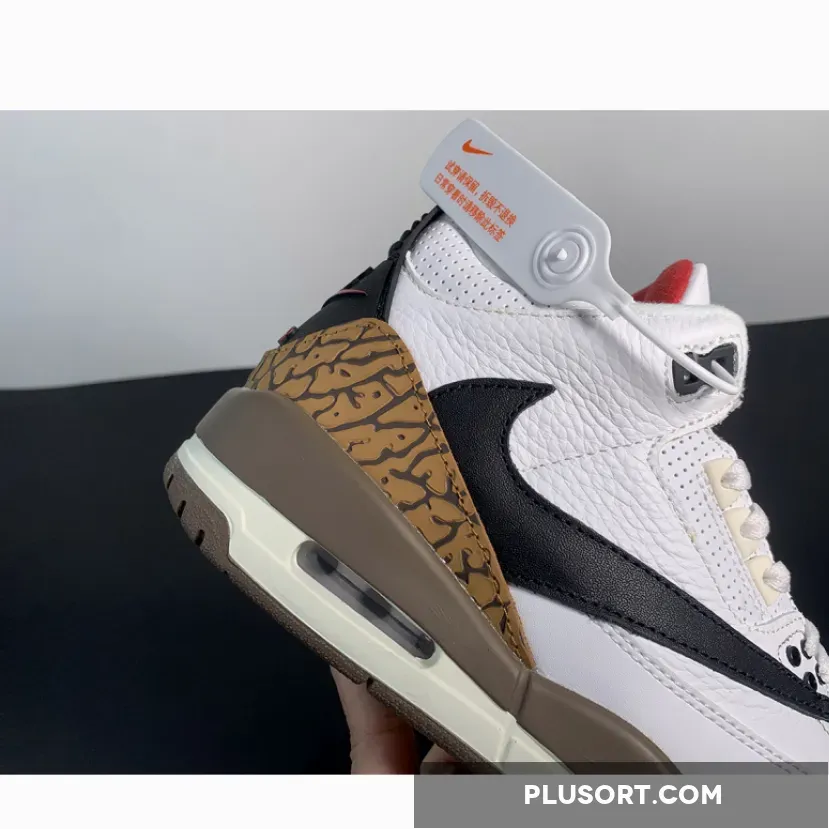The upper of the shoe is clad in a “White / Tan / Brown / Black” color scheme. The base of the shoe is clad in a plain white hue, which is disturbed by the iconic elephant print on the heels and mudguards. The branding elements are added to the heel counters and the visible air unit on the midsole.